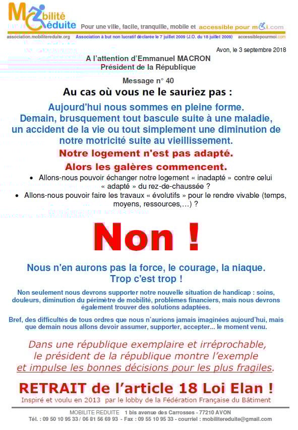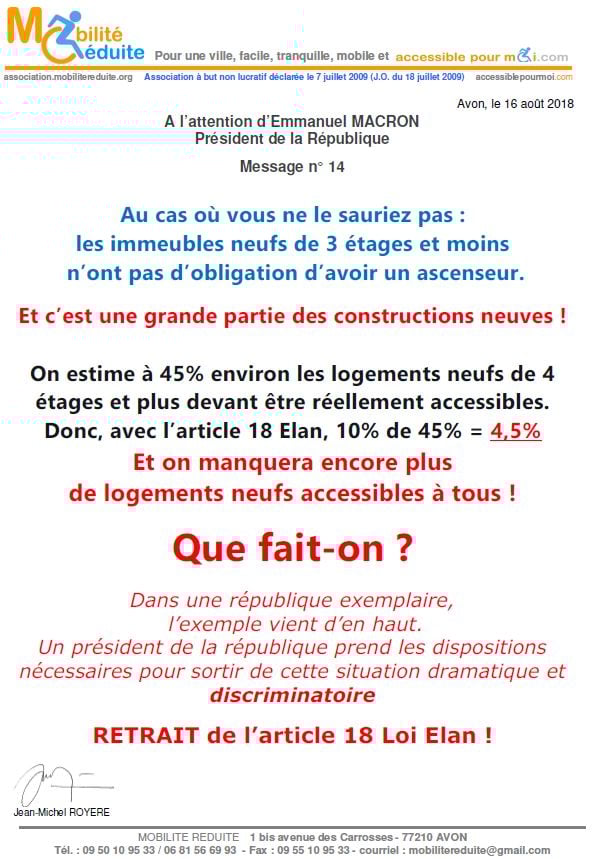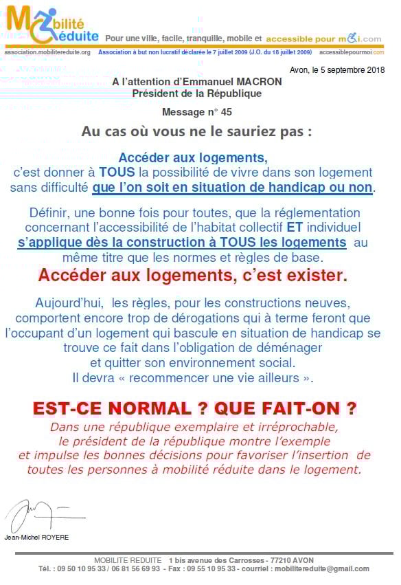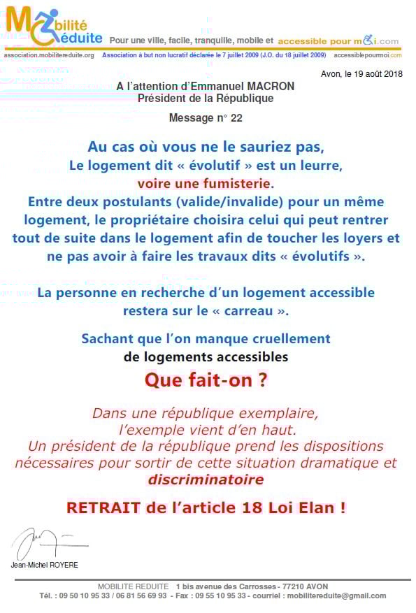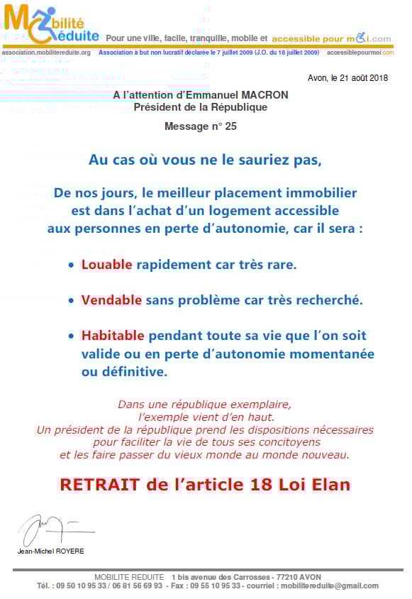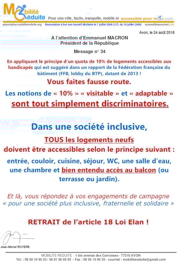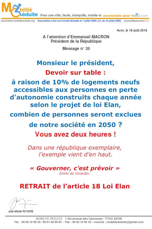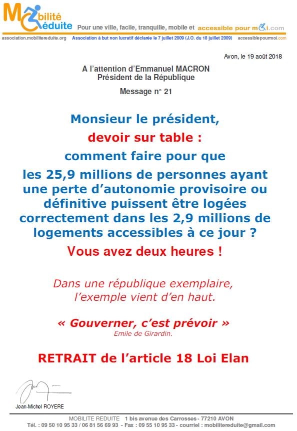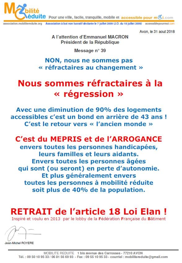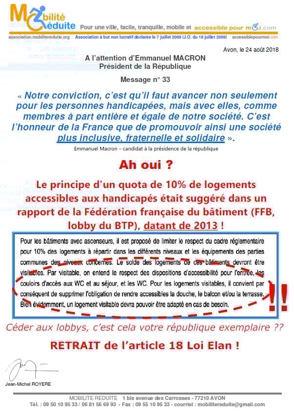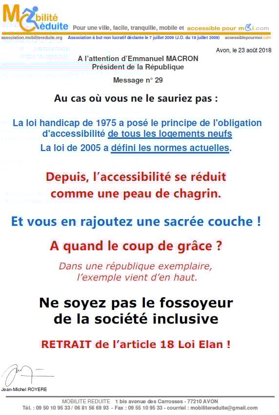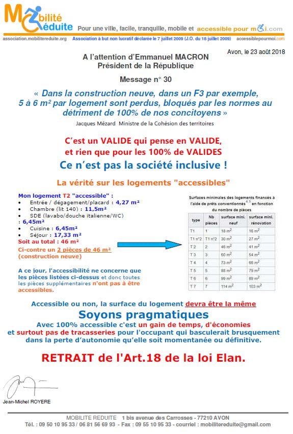 le 23 nov. 2018 Emmanuel Macron a signé en "catimini" la Loi Elan qui a été publiée au Journal Officiel de la République Française (https://www.legifrance.gouv.fr/eli/loi/2018/11/23/TERL1805474L/jo/texte …) avec l'article 64 (ex18) réduisant de 80% les logements neufs accessibles. Le fait du Prince ? La société inclusive n'est pas pour demain.