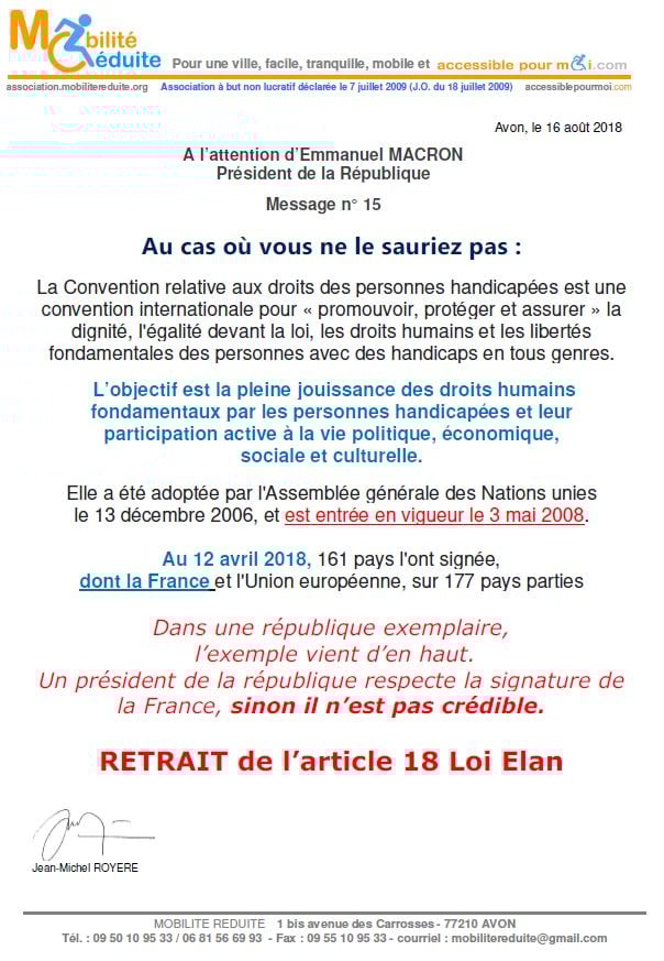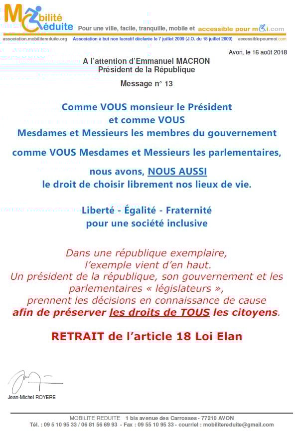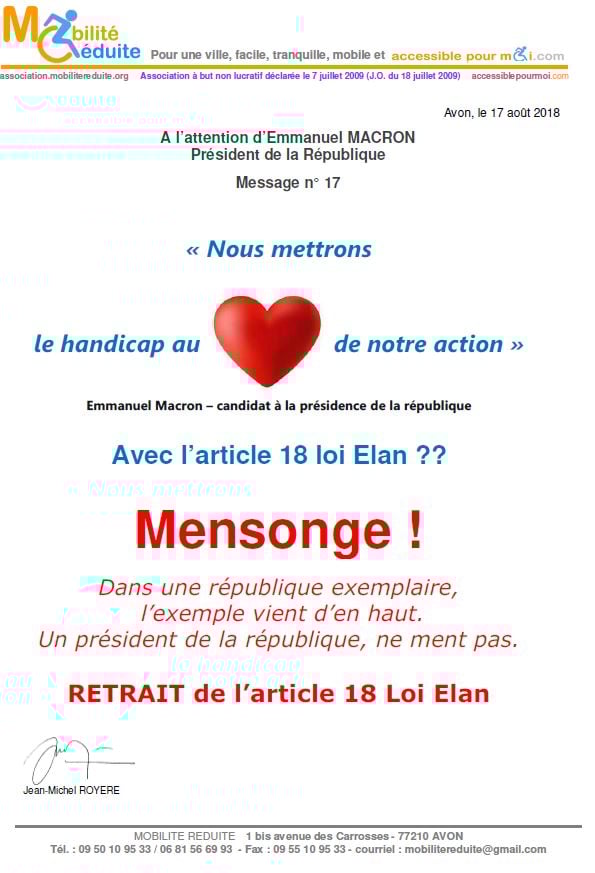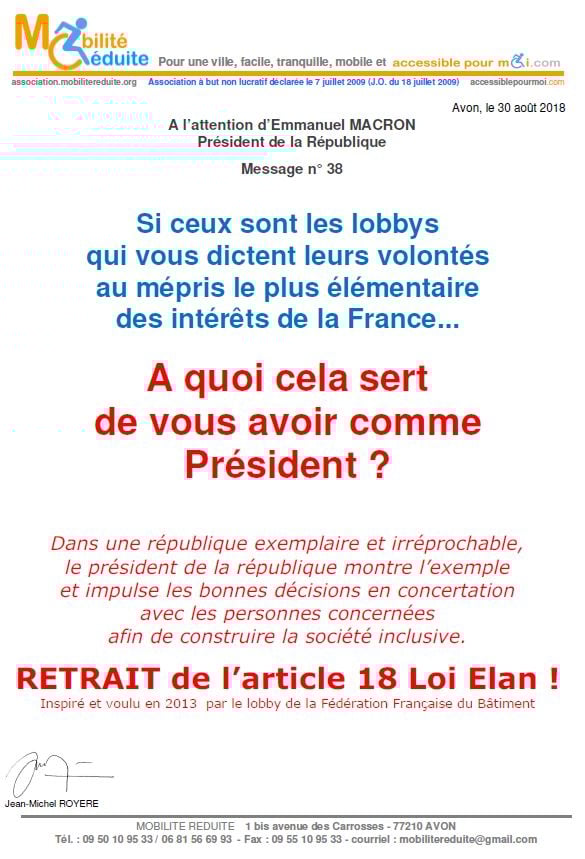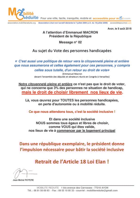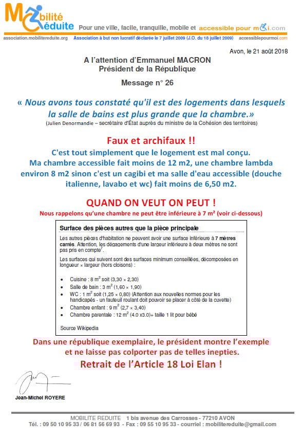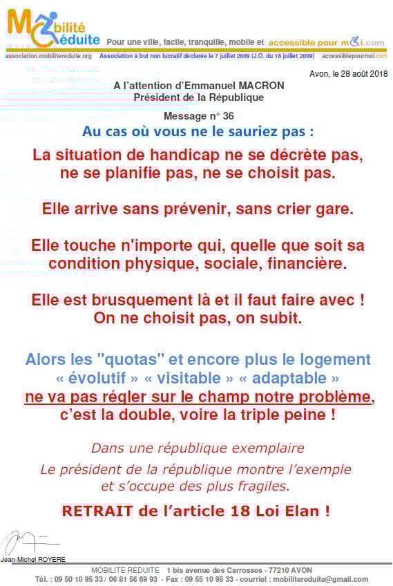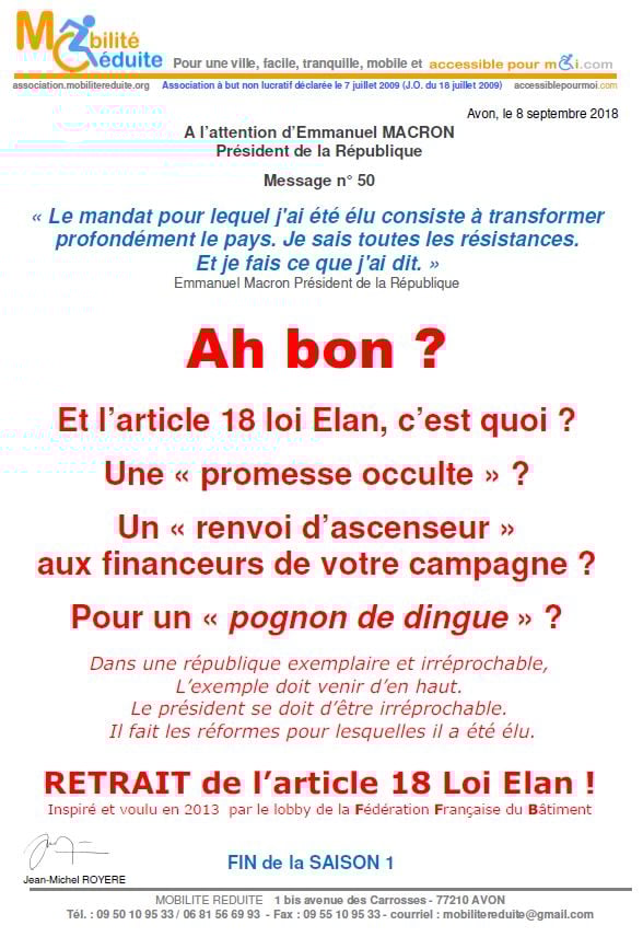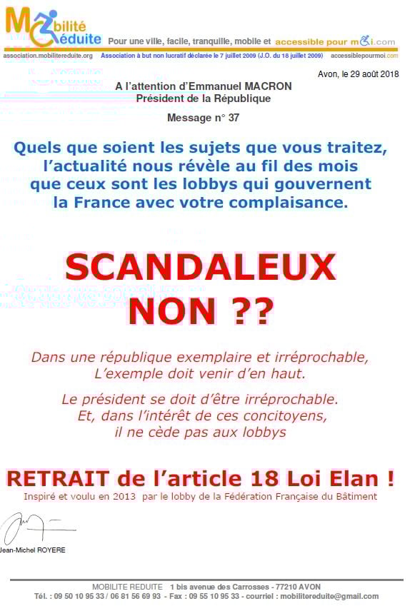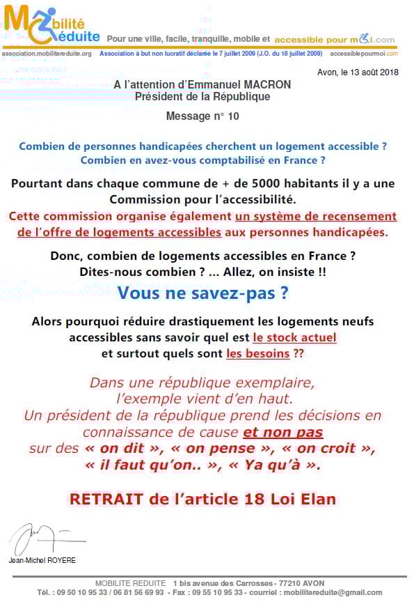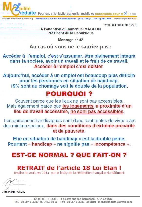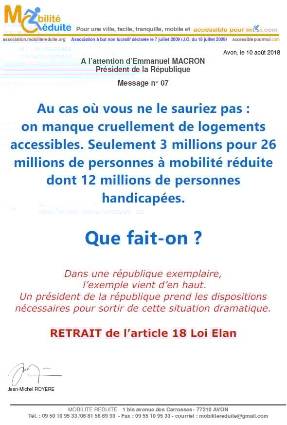 le 23 nov. 2018 Emmanuel Macron a signé en "catimini" la Loi Elan qui a été publiée au Journal Officiel de la République Française (https://www.legifrance.gouv.fr/eli/loi/2018/11/23/TERL1805474L/jo/texte …) avec l'article 64 (ex18) réduisant de 80% les logements neufs accessibles. Le fait du Prince ? La société inclusive n'est pas pour demain.