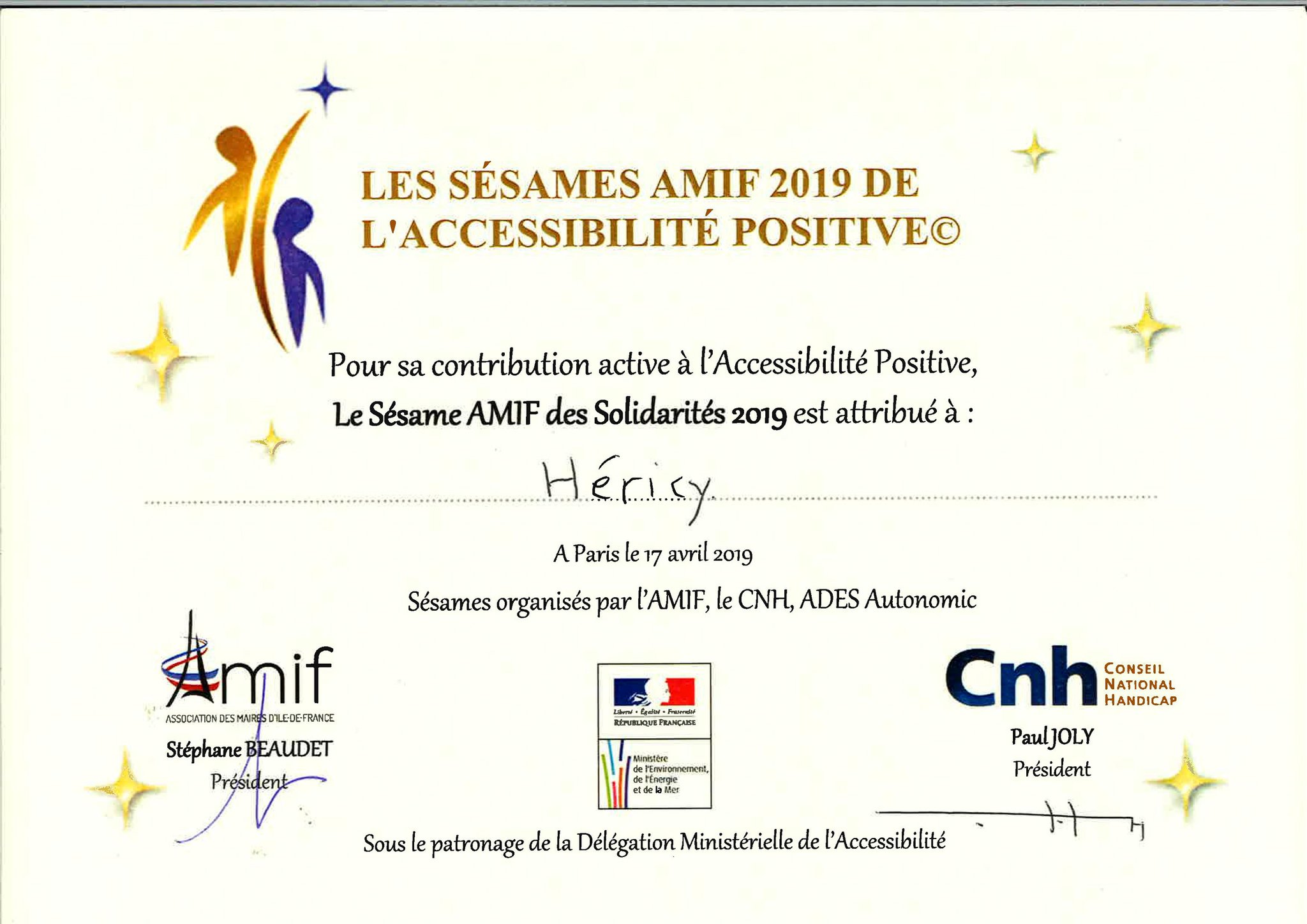 En 2019 la commune d’HERICY (77850) a reçu un Sésame « Coup de Cœur » pour la mise en accessibilité de la Maison de santé